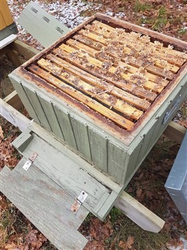 Jag tog bort lådan som var full med foder så att inte de andra samhällerna ska börja hämta mat när solen kommer tillbaka i vår.