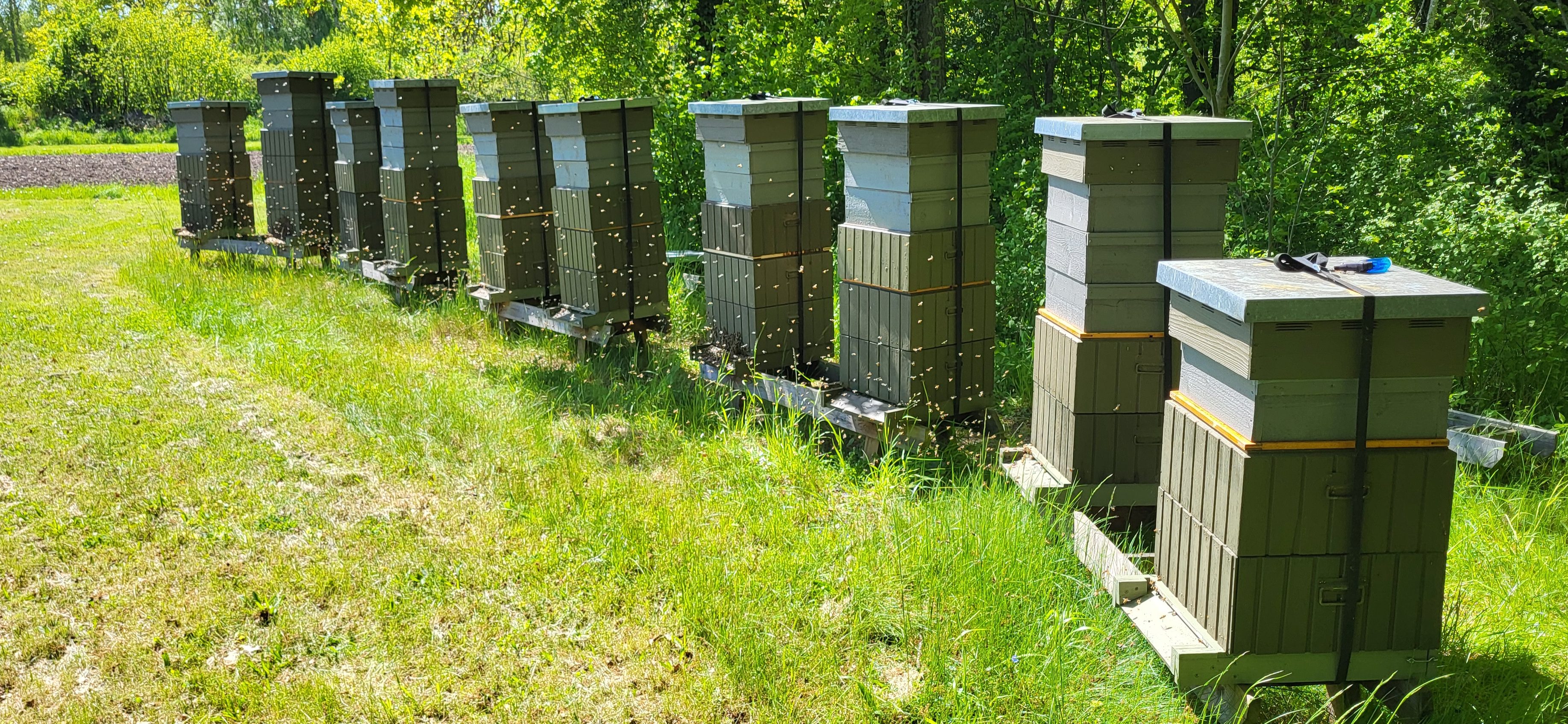 När jag gick igenom samhälle efter samhälle var allt fullt med honung. Alla HLS lådor fyllda och täckta, översta yngellådan riktigt tung. Så det var inte konstigt att de var sura på mig. Hittade täckt drottningcell i flera samhällen samtidigt som det fanns ägg och yngel. Tog därför bort cellerna och satte till så mycket lådor som fanns, så får vi se hur det går, ska kolla till dem nästa vecka igen.